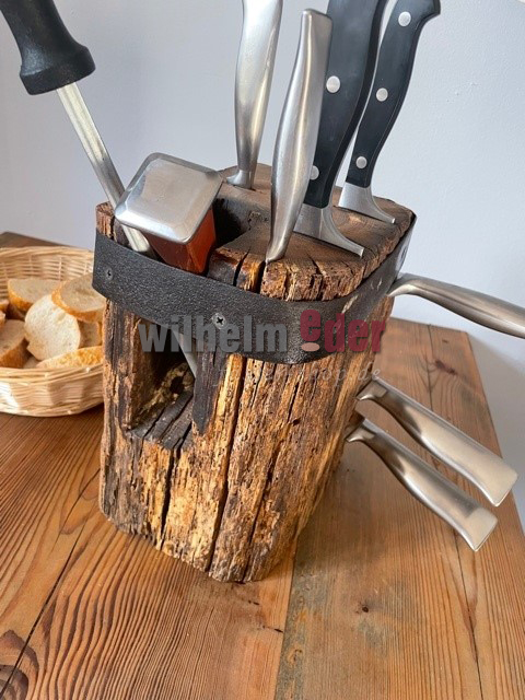 We clean this framework carefully and cut it sideways and vertical and fix these blocks with an original old barrel hoop with patina, which works to prevent the knives from overtuning. We varnish the wood with alimentary proofed linsed oil.