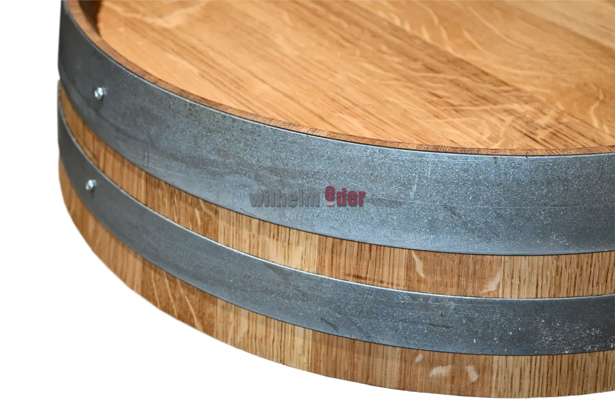 The decorative barrel heads have been made out of old barrels by our carpenters. The barrel heads have been cut from old wine barriques to a length of about 9-15 cm (depends on the placement of the hoops).