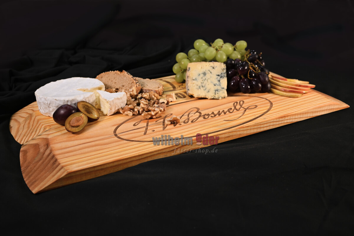With its vivid grain, walnut wood is the most beautiful wood imaginable for wooden furniture and home accessories. From the remaining wood of our barrel production, we manufacture, quite sustainably, unique walnut boards and platters, for stylish arranging and serving of food. We deliberately avoid varnish in the surface treatment, but use natural grape seed oil, because this allows the wood to breathe and gives it a silky matte sheen. Over time, repeat this process of oiling. Wash the board briefly with hot water if you have processed meat, fish, onions, etc. on it. Please wash it from both sides, otherwise the board may warp. To dry, please place it on edge and well ventilated so that it can dry evenly. If any unloved odors are absorbed into the walnut, you can neutralize them with a little baking soda. Each walnut tray is unique, which differs in shape and grain.
