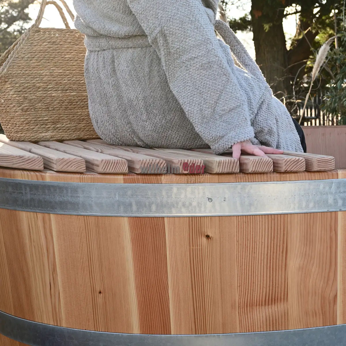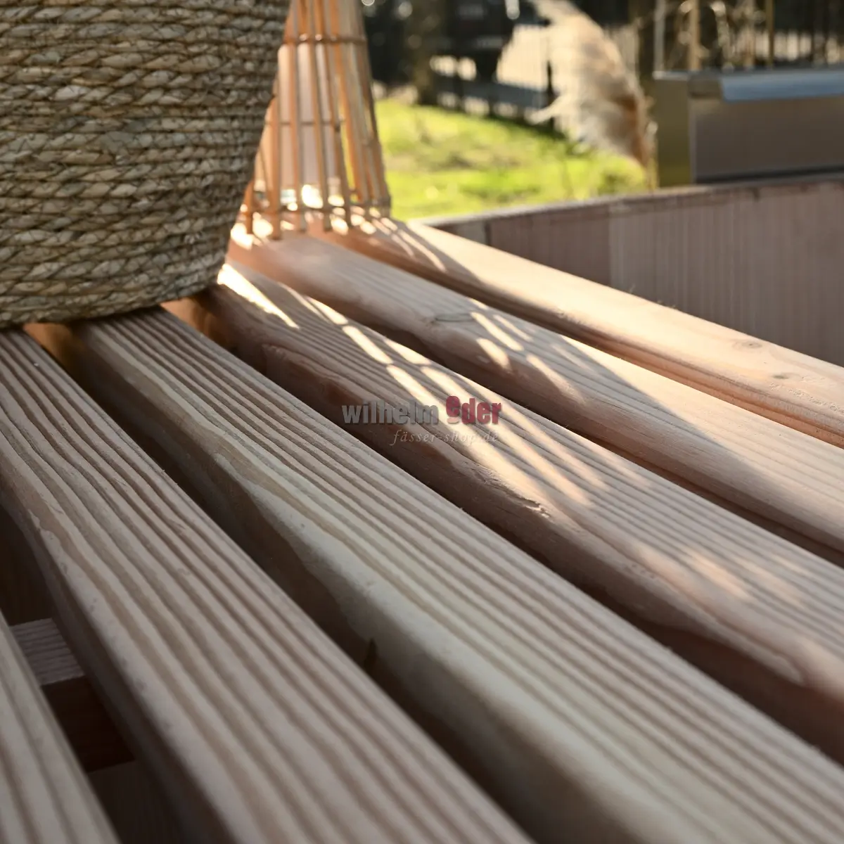 With the dividable sun deck, which is crafted by our carpenters from Douglas fir to match the tub, the water does not overheat in summer. In addition, it is ideal as a place for sunbathing, sitting, dangling your feet in the water, or as a perfect surface for placing drinks.