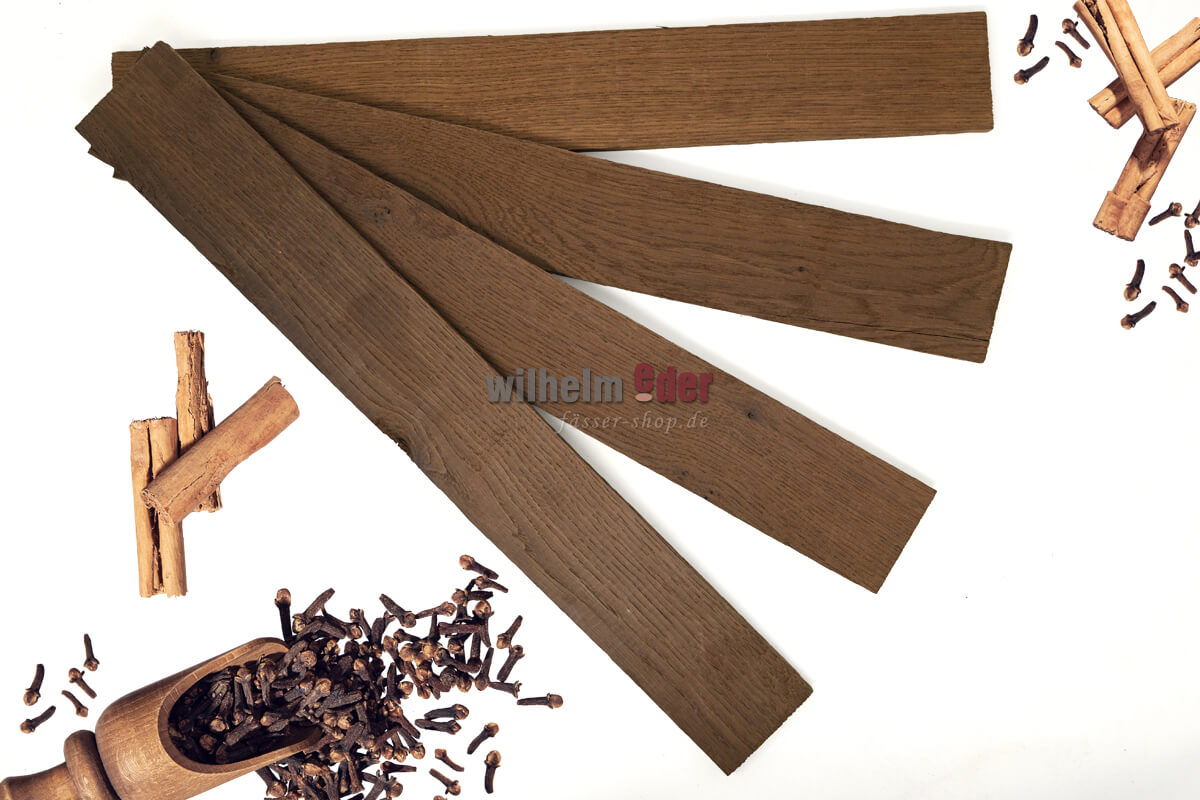 Mini staves of 40 pieces each in a shrink-wrapped food-safe infusion bagThe mini staves are supplied 40 at a time in an infusion bag. This bag is shrink-wrapped in plastic and packaged in food-safe packaging. The High Caramel Staves give off a wide range of complex and varied aromas with a focus on caramel. Taste of strong toffee and creamy coffee notes paired with caramel burnt sugar, roasted nuts and slightly smoky aromas in the background. The alternative product for all applications where an exuberant mouthfeel and dessert notes are required. It can be used in both wine and distillates, and the extraction time is quite short compared to barrels. When used in wooden barrels, well-integrated maturation is possible in addition to maceration.