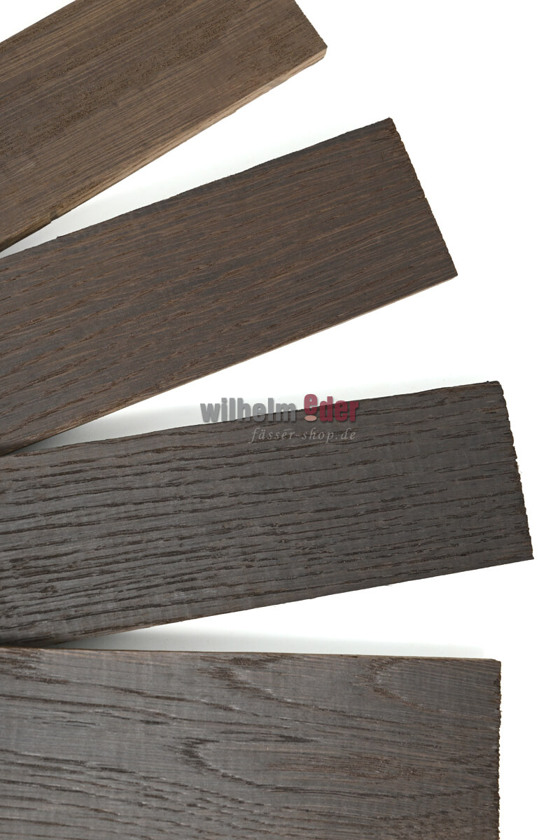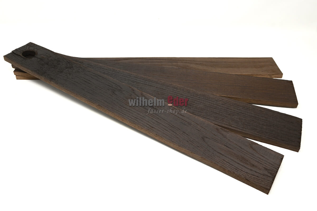Staves that can be used in high-quality steel tanks or big wood barrels. The tank staves made of American oak are offered in five different toastings. These staves are packed at 30 pieces each, and within a food safe plastic foil secured in a hygienic manner to avoid dirt. The staves are drilled at both ends in order to be able to attach them to the tank by using a high-quality steel rod or string.Just as the barrel doves these doves are air-dried for several months before the further processing. Toast Konvektormat: Hot air process quickly producing aroma flavours Toast Infra Rot: Process slowly and sustainably producing aroma flavours