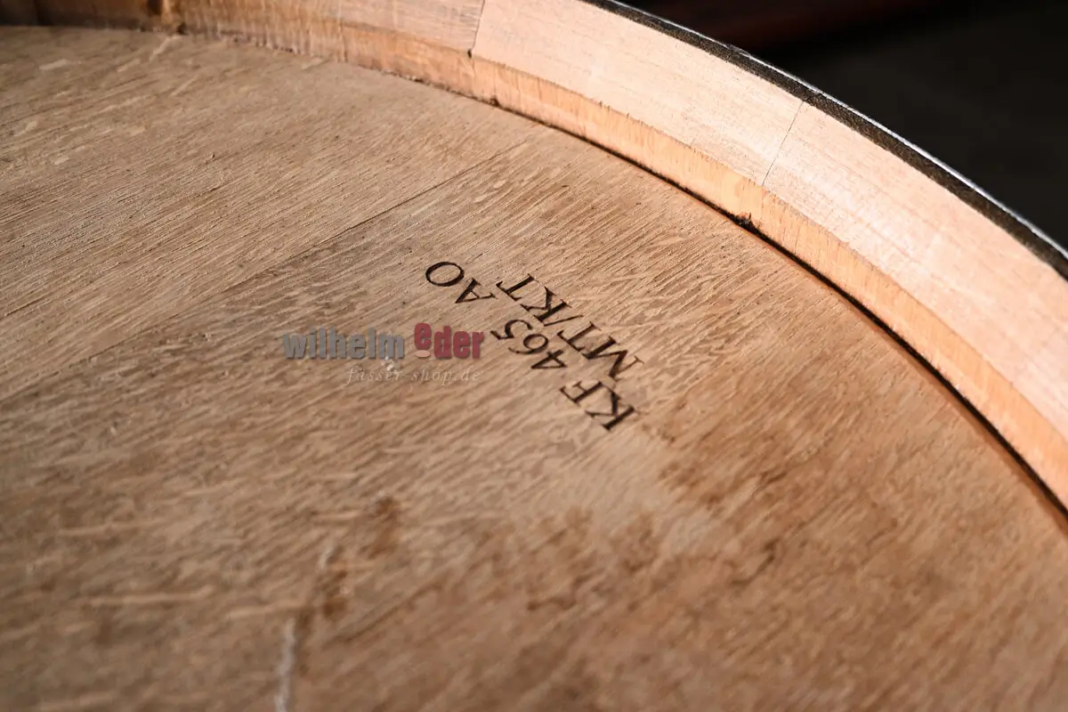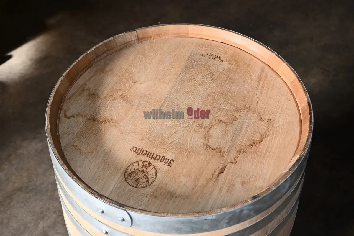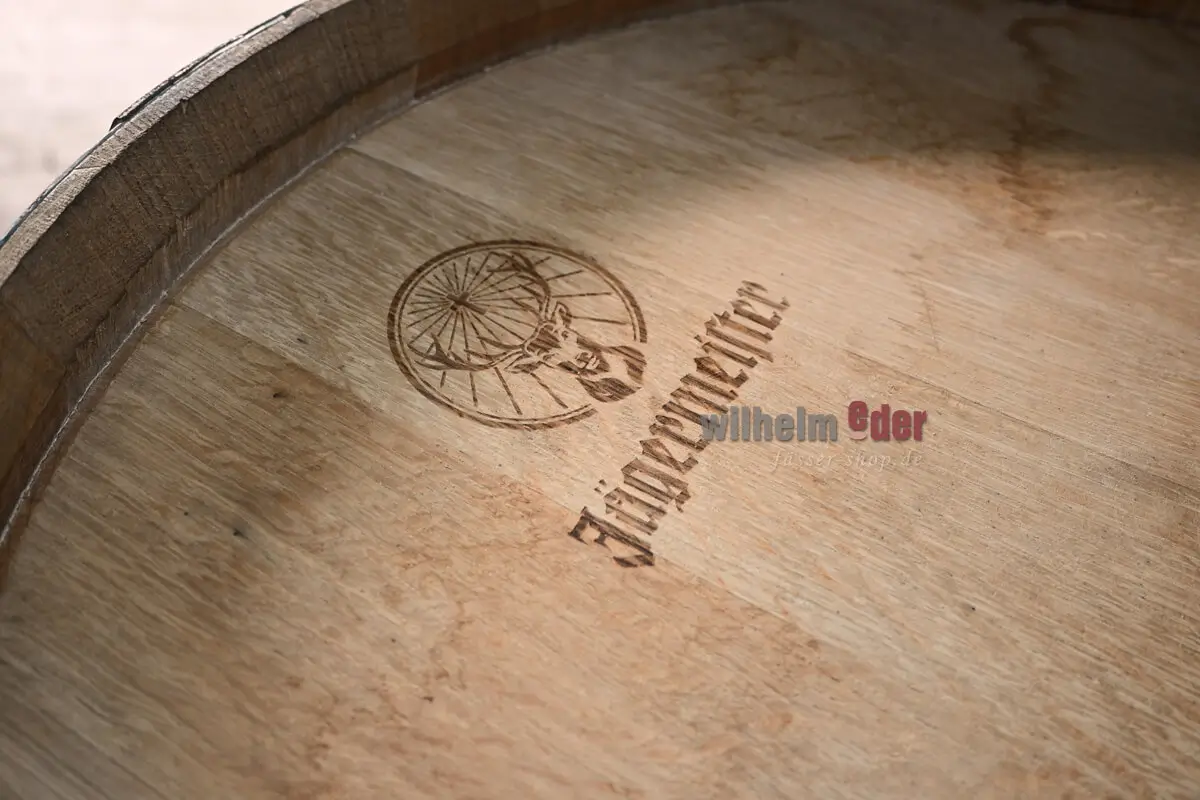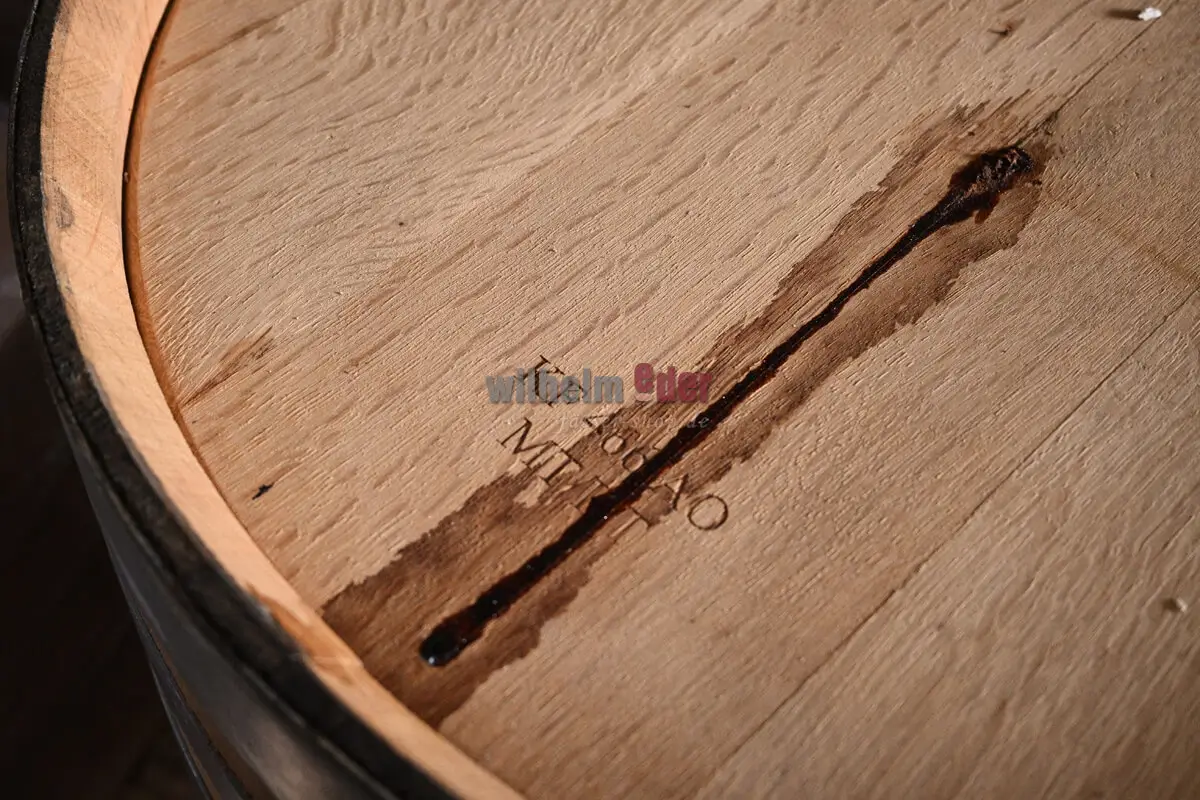 This 300-liter oak barrel was previously used for aging herbal liqueur. The original laser branding is still visible. The top has been cut out and fitted with a wooden handle.