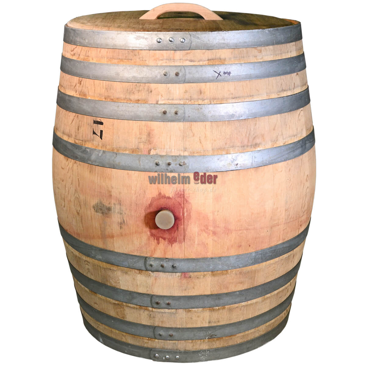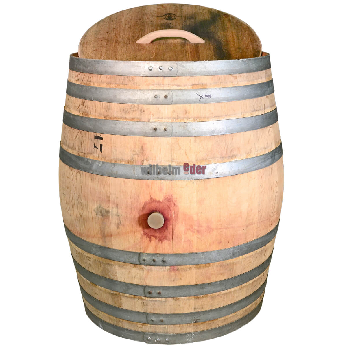 Rain barrel made from a used 500 l oak wine barrel. The lid has been removed and fitted with a wooden handle. Various designs. The barrel may be stained by the red wine that has matured in it.