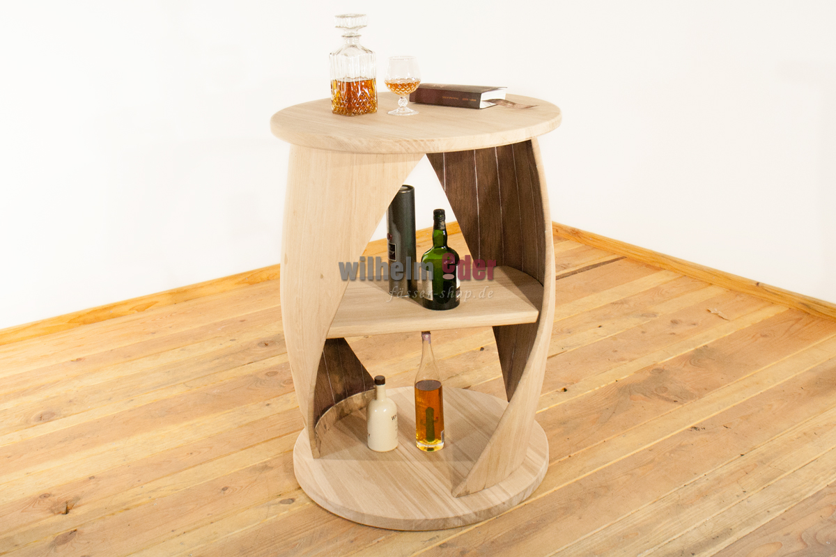 If you are looking for an original and eye-catching bar for your home or your business, the ´Perle´ fits the bill. Everything about this Perle is different and special. The shape of the Perle is very individual so the carpentry workshop was able to turn it into an eye-catching piece of furniture. The upper section is opened by a hinged single leaf door and its base is made out of a piece of glass, about 62cm wide, embedded on a wooden cross. The lower section is opened by hinged double doors. So there is plenty of space for your special items. Inside the barrel, the staves are stained red which is a totally natural result of the wine ageing process. Matt clear lacquer is applied on the outside of the Perle, the barrel hoops are gold lacquered and the dome lid is black. Last but not least, the Perle is lit in two ways. Inside the top of the Perle, small lights with batteries have been installed with multi coloured LED strip lights fitted under the base. Both types of lighting can be remote-controlled. The elaborate matching base is included.Before making shelves, we let the barrels dry and glue the staves individually. This elaborate process ensures the stability of the shelf and prevents the wood from warping due to temperature fluctuations. Please note, however, that too dry and warm heating air does not do the barrel good.
