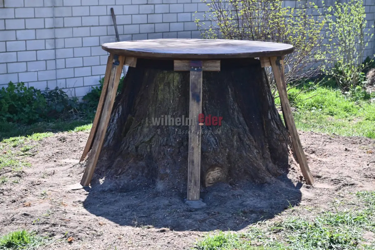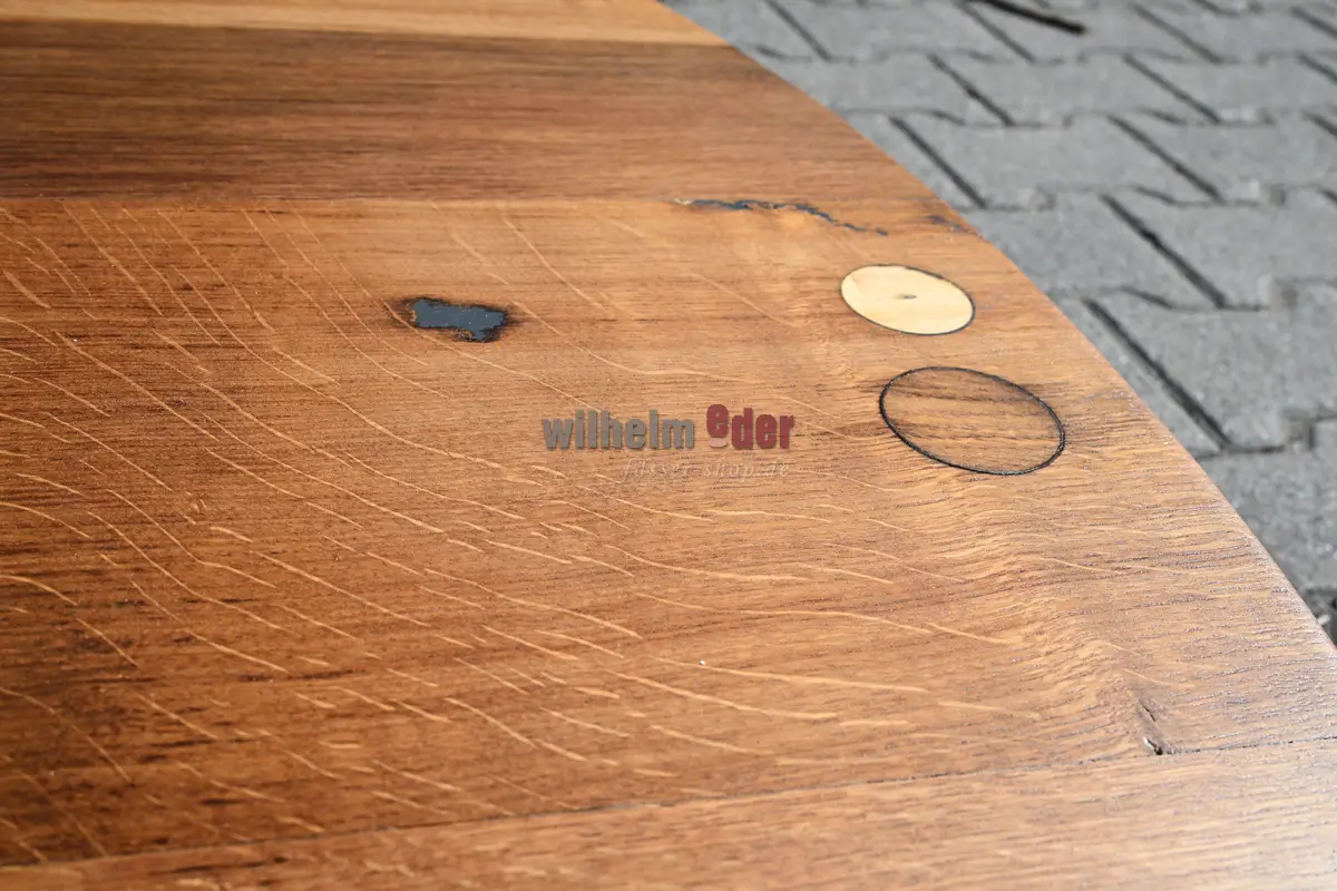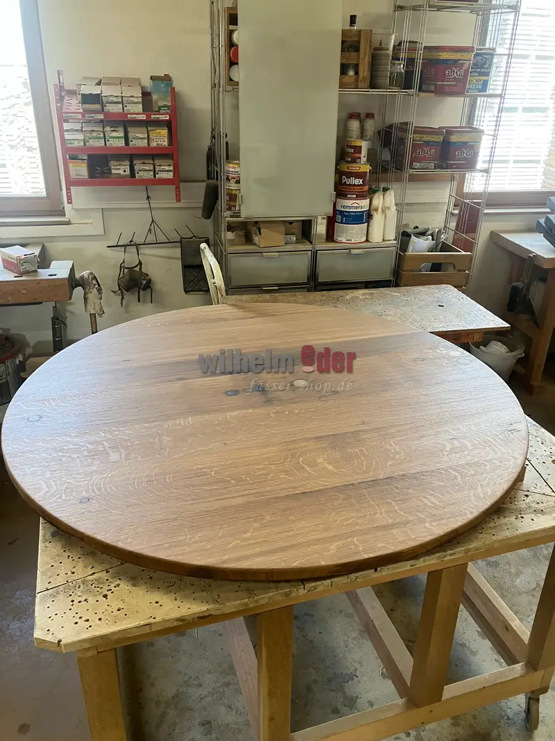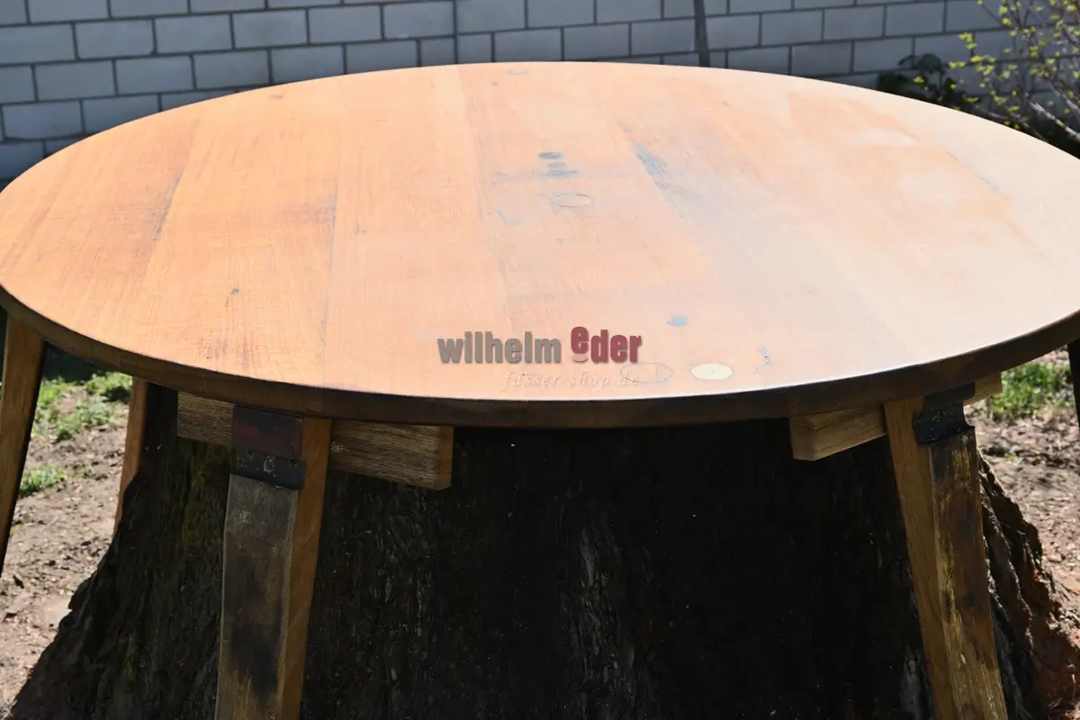In our workshop, the discarded heads of old large barrels – round or oval – are transformed into characterful tabletops with history.
