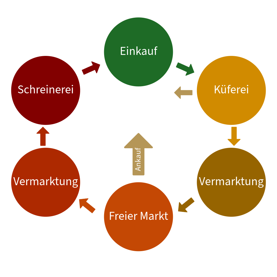 Entscheidend für unser Verfahren der Kaskadennutzung sind die fortwährenden Qualitätskontrollen als Bindeglied zwischen den Produktionsschritten. Vor und nach dem Einkauf von Rundholz entscheidet die Holzqualität über den Einsatz in der Küferei oder in der Schreinerei. Holzqualitäten, die dem Fassbau nicht genügen finden eine Verwertung in der Schreinerei, während die Top-Qualitäten zu Fässern verbaut werden. Hierbei scheuen wir uns auch vor keiner Umlenkung der Produktwege: stellt uns das Holz in der Küferei doch nicht zufrieden, gelangt dieses auch auf diesen Weg in die Schreinerei. Die Vermarktung unserer Produkte in den freien Markt erfolgt nach erneuter Qualitätskontrolle. Aus diesem Markt schöpfen wir im Ankauf wiederum vorbelegte Fässer. Diese finden bei nicht genügendem Standard ihren Weg in die Schreinerei; bei Top-Qualität werden solche Fässer aufgearbeitet, kleiner gebaut oder in originalen Zustand erneut vermarktet.