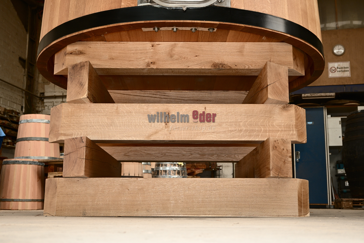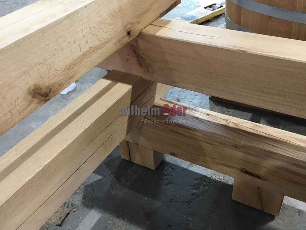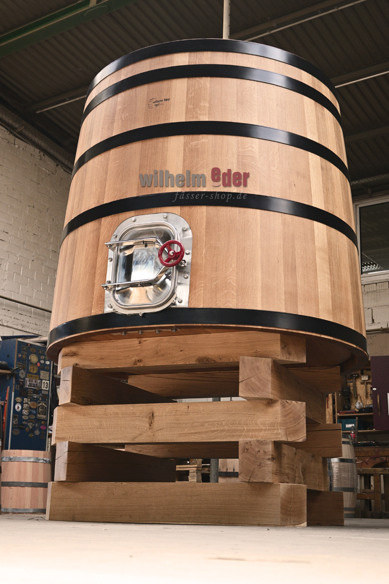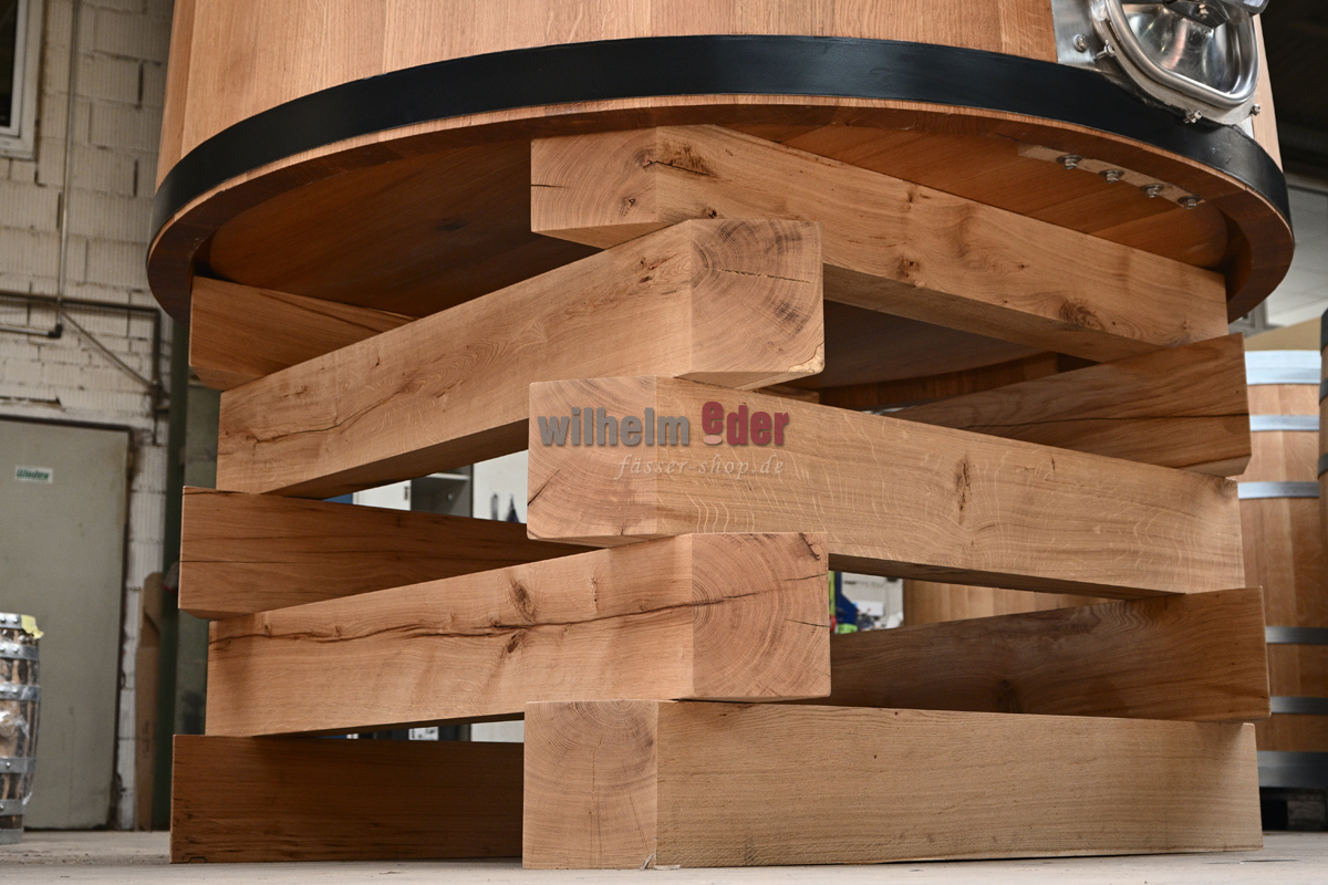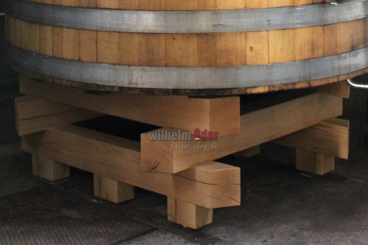 Wooden barrel storage made of air-dried oak wood from our own cutting for an approx. 6000 l fermentation tank. The dimensions are adapted to the vat and can therefore vary.